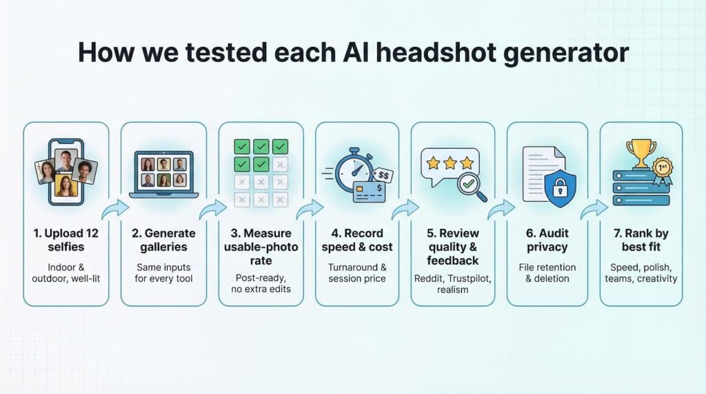 First, we uploaded a controlled set of 12 well-lit selfies (indoor and outdoor) to each platform. We counted how many finished images were truly usable: crisp, natural looking, and LinkedIn ready with zero extra edits. That usable-photo rate became our north-star metric because sifting through fifty near misses wastes your time.