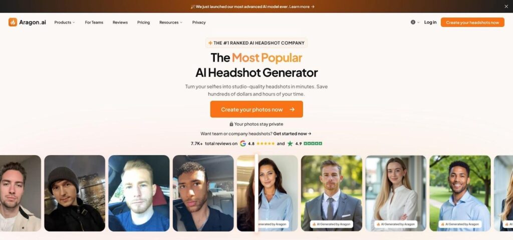 Aragon AI realistic AI headshot generator homepage screenshot